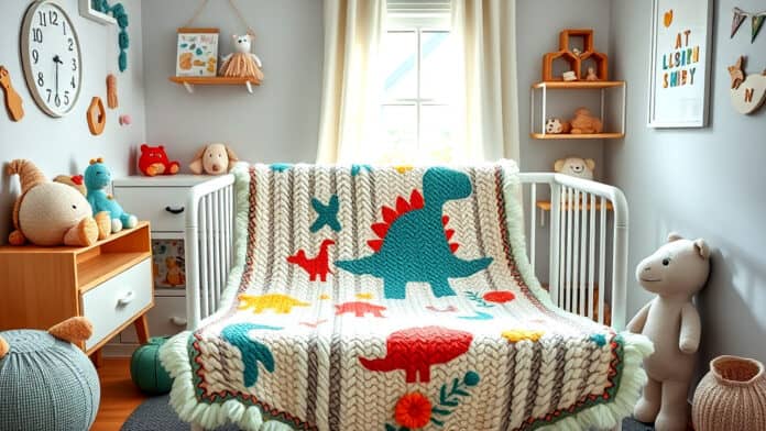 Embark on a knitting adventure with a dinosaur-themed baby blanket. These playful designs add a prehistoric touch to your nurseries. With a variety of free knitting patterns for baby blankets with animals, including dinosaurs, you’re sure to find a project that roars to life.